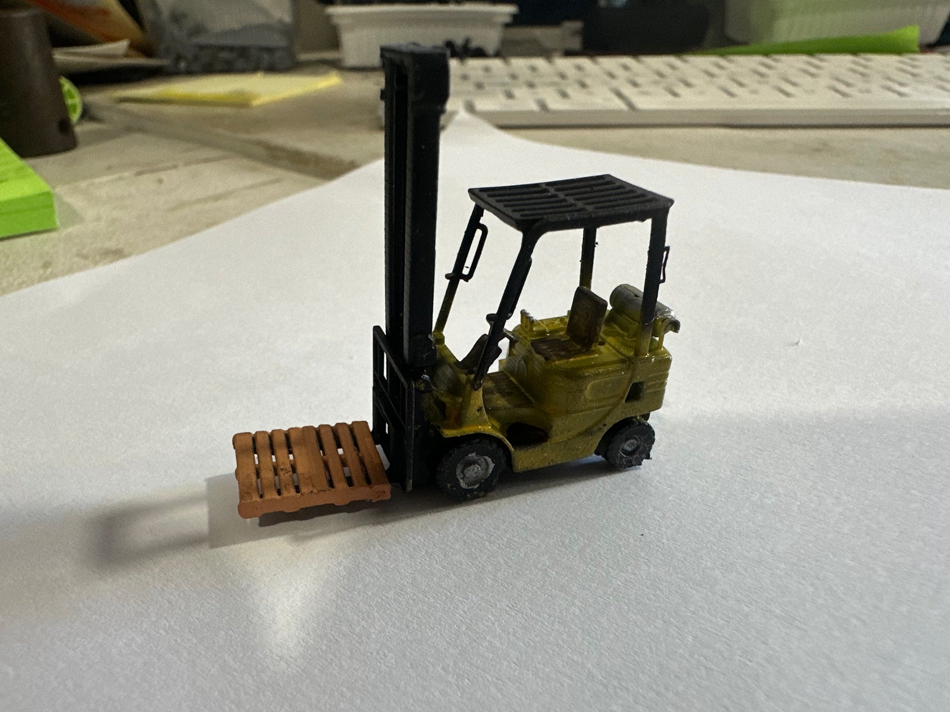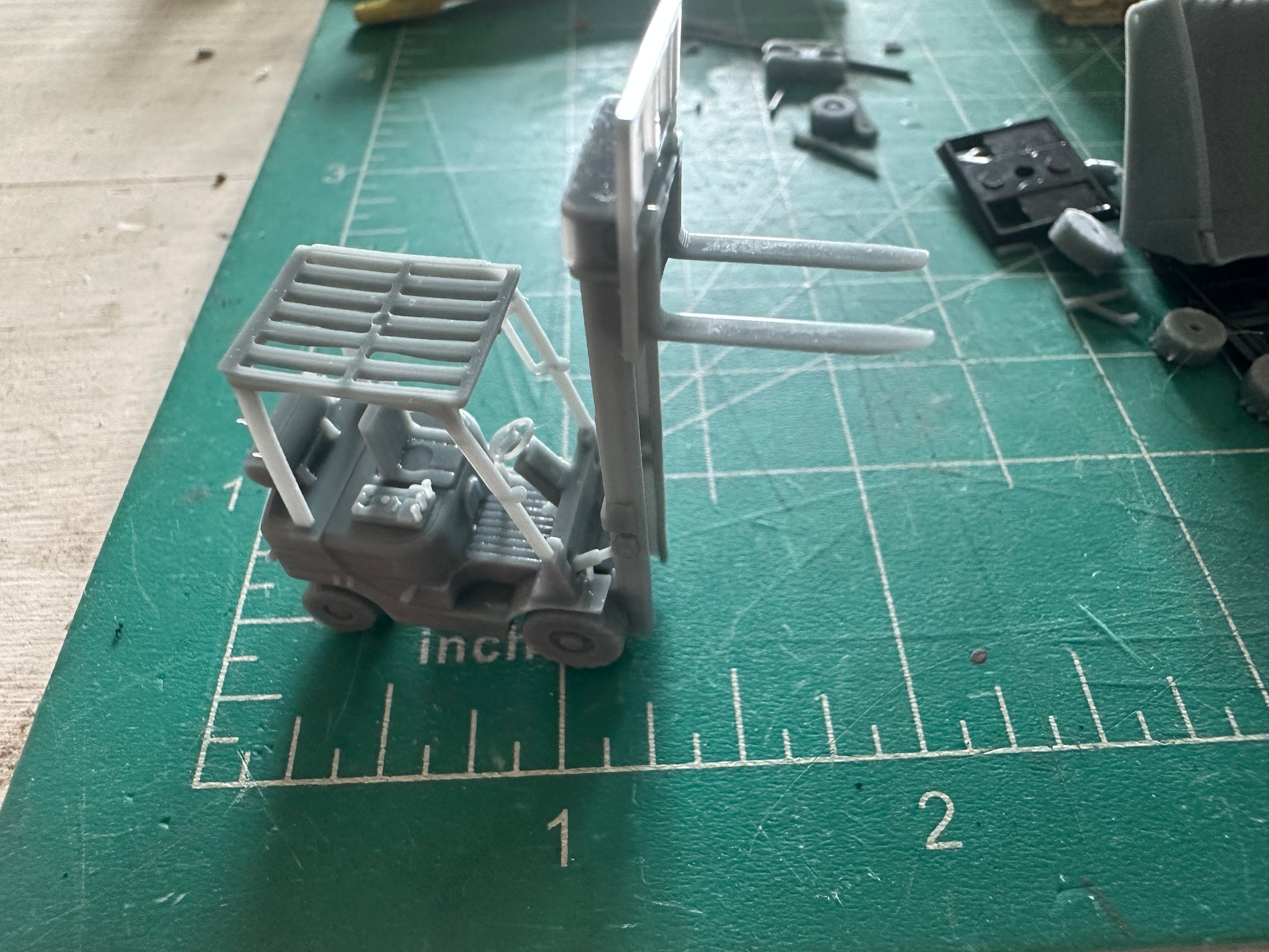 This is a 3d printed forklift with a adjustable mast height. Model is unpainted and painted versions are for display only